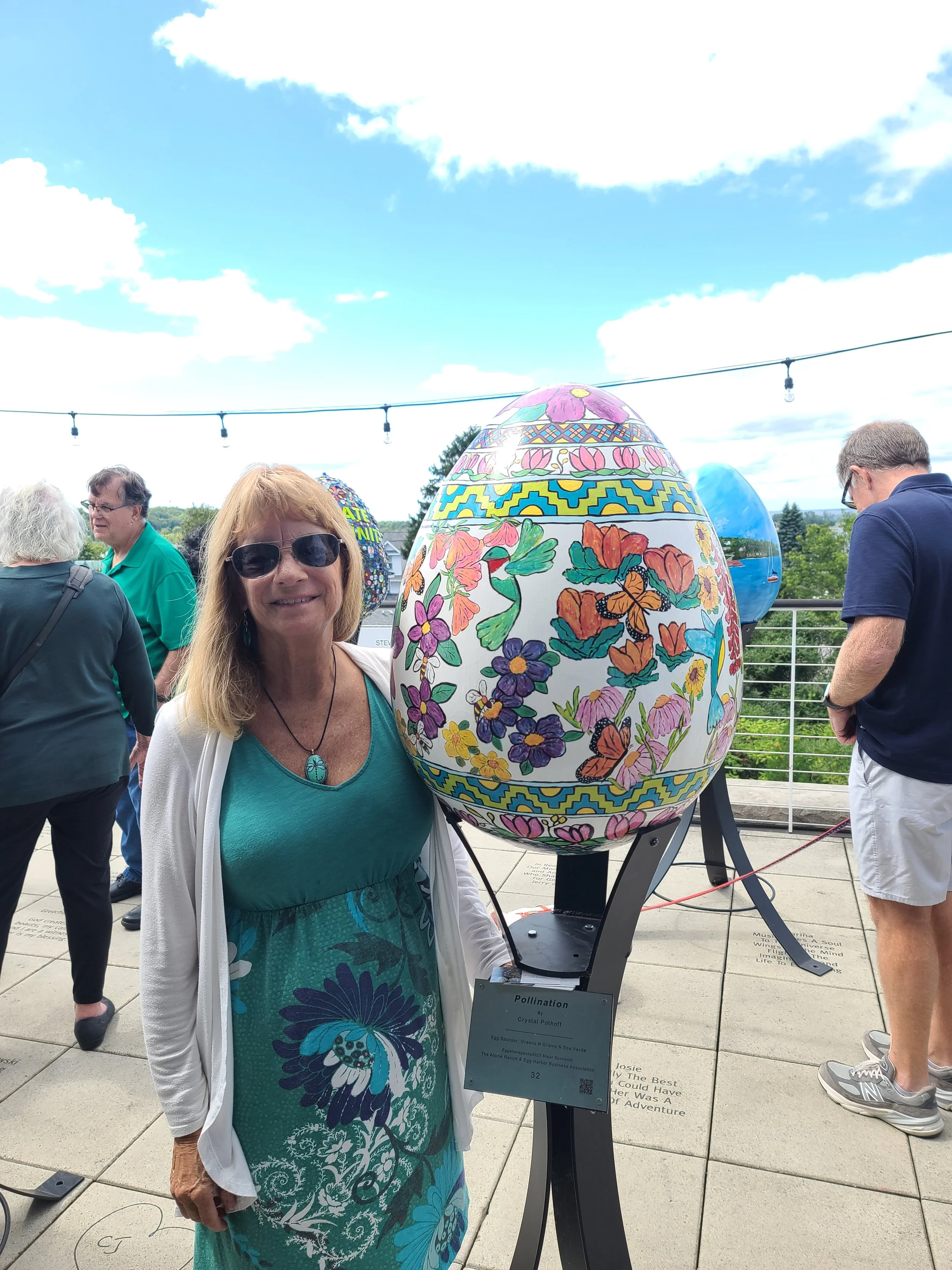 I was thrilled to be one of 35 artists to participate in Eggstravaganza 2025 for the Public Arts Initiative in Egg Harbor, Wisconsin. This large plastic egg was inspired by a pattern I did on a rhea egg. The entire project, while challenging was a lot of fun. And if you look closely, you’ll see the dragonfly pendant is from my collection of goose egg jewelry!